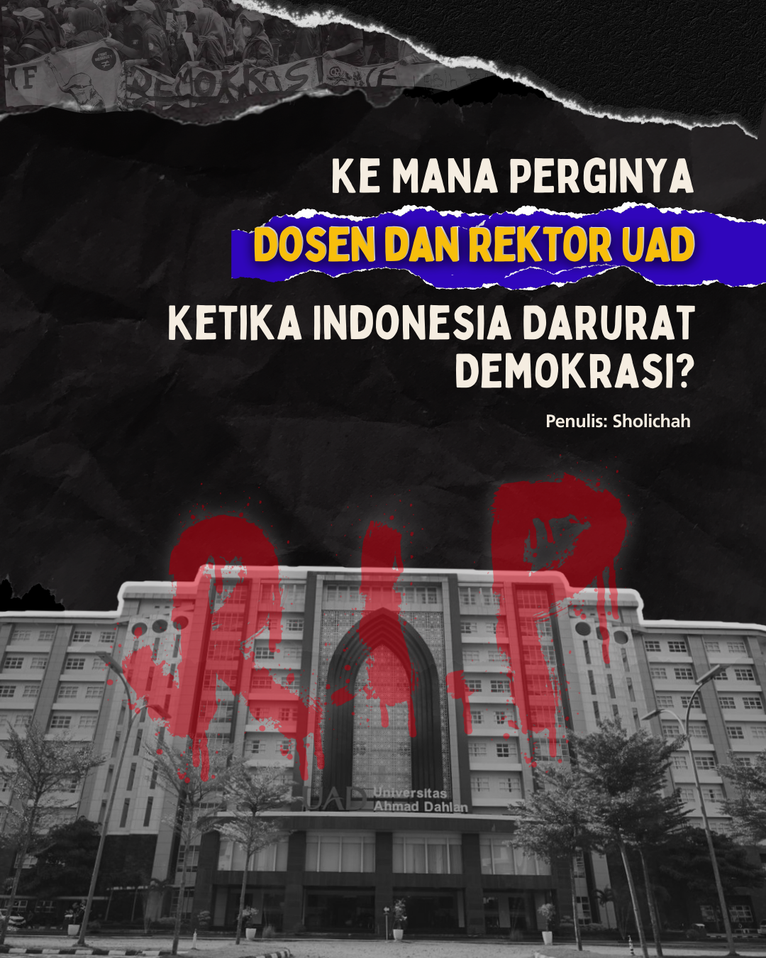 Pada aksi unjuk rasa terhadap revisi RUU Pilkada di Yogyakarta, saya melihat rektor UII berorasi dan 100 dosen UII lain ikut menjadi massa aksi, pun melihat banyak sekali pernyataan sikap kampus lain untuk menolak segala cara perusakan demokrasi negeri ini. Lalu, ke mana rektor UAD? ia terus saja meringkuk di balik kenyamanan, takut ambil risiko dan cuma mau main aman.